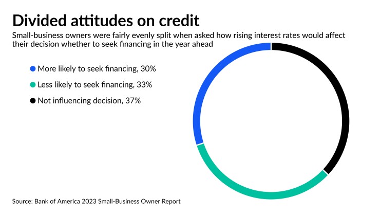 Not surprisingly, given that the Federal Reserve has hiked the federal funds rate 10 times since the start of 2022, 67% of the business owners BofA surveyed are worried about interest rates. That's up 10% since last year. Those concerns produced a split opinion on credit: 33% said the rising federal funds rate, which climbed to 5.25% earlier this month, has made it less likely they'll seek financing, compared to 30% who said it's increased the likelihood.