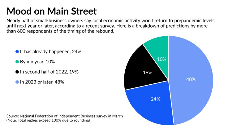 Nearly half of small-business owners surveyed by the National Federation of Independent Business in March said they think it will take until 2023 or later before their local community’s economy has recovered to prepandemic levels.