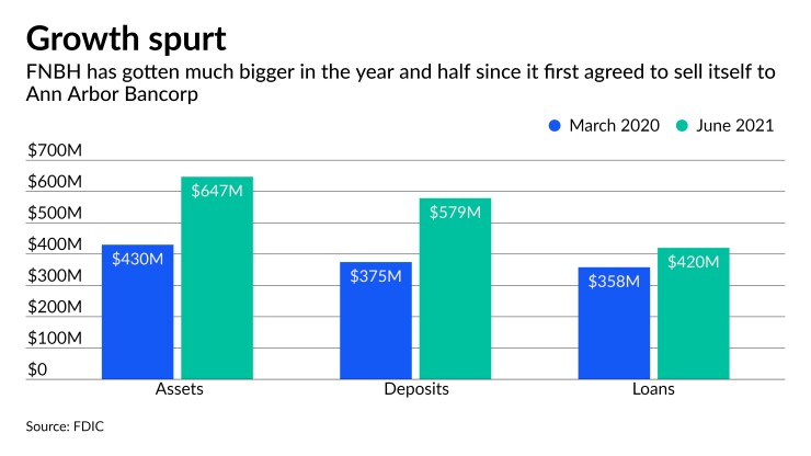 In the latest agreement, Ann Arbor would pay $116.5 million in cash for FNBH, which has grown significantly in the past year thanks in large part to its participation in the Paycheck Protection Program. FNBH made more than $103 million of PPP loans in 2020 and 2021. FNBH’s equity capital, which totaled $53.9 million on March 31, 2020, had grown to $62.4 million at the end of the second quarter, according to the Federal Deposit Insurance Corp.