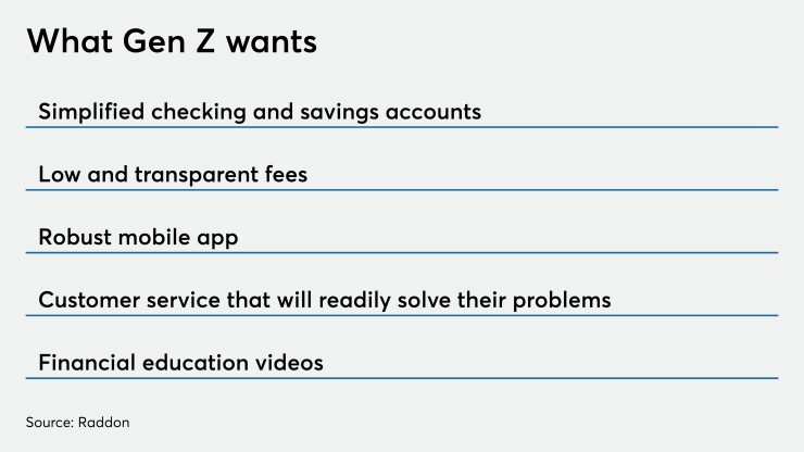 Vahrenkamp and Karen Kislin, strategic adviser at Raddon, list a number of things that Generation Z wants from banks, based on surveys they’ve done: simplified account offerings (perhaps a checking account that encourages good savings habits, such as the one offered by SoFi); low and transparent fees; a robust mobile app; and customer service that will readily solve their problems — because it’s easier than ever to switch banks if one is unhappy.