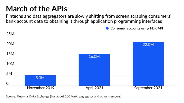 APIs are considered more secure and efficient than screen scraping. In early September, the Financial Data Exchange reported that 22 million consumer accounts are now linked to the FDX API, a standard data-sharing platform, an increase from 16 million in April.