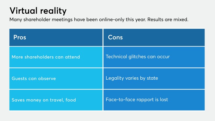 A spokesperson for U.S. Bank — which announced in March that its April annual meeting would be virtual — expressed a similar thought. “Having a virtual annual meeting meant that our leaders were unable to meet in person with local employees — from market leaders to branch tellers to local shareholders, key customers and U.S. Bank retirees,” the spokesperson said by email.