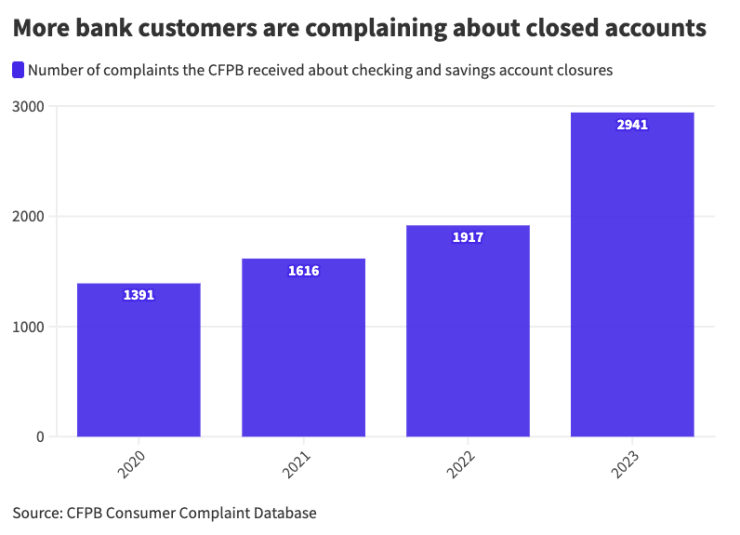 The Consumer Financial Protection Bureau received 2,941 complaints about bank savings and checking account closures in 2023, about a 50% increase from 2022 and nearly double what it was in 2020. In addition, journalists at