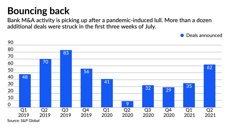 A total of 106 U.S. bank deals were announced through July 16 of this year, compared to 55 over the same period last year, according to an S&P Global tally. Total deal value in 2021 so far jumped to $33.92 billion compared to $27.84 billion for all of 2020, the firm said.