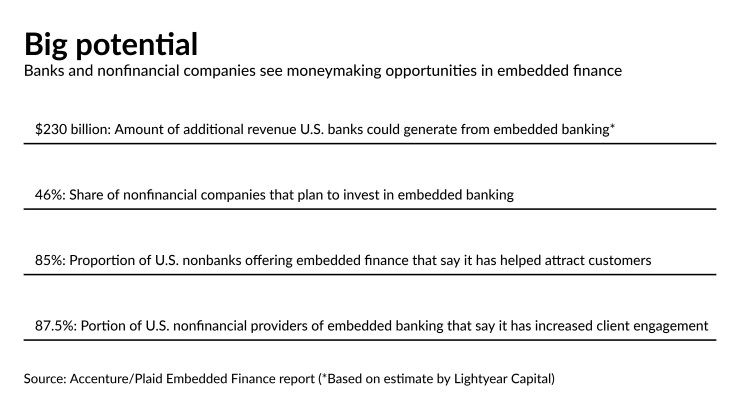 “You're basically extending your brand,” Leimer said. “But the question is, would the consumer even know?” Regulators may at some point step in and set rules around embedded banking, he said.