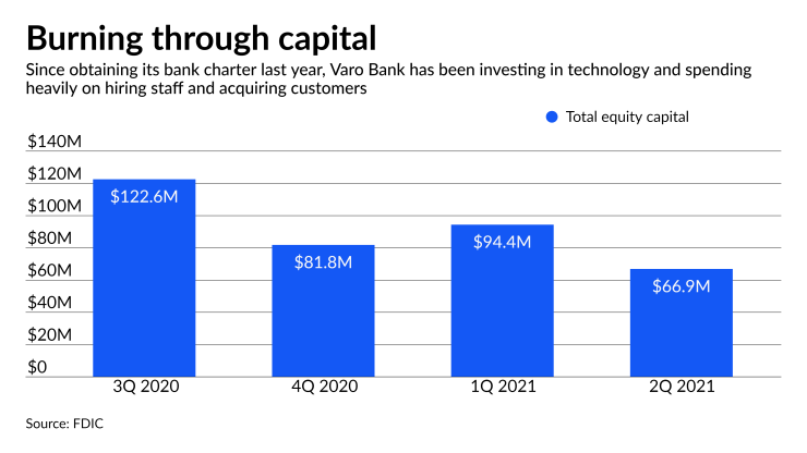 Since its inception Varo Bank also has burned through capital and reported a combined net loss of $169.2 million, according to Federal Deposit Insurance Corp. data. Total bank equity capital fell to nearly $67 million at June 30, down from $122.6 million on Sept. 30 — a 45% decline. Quarterly noninterest expenses more than doubled to $74.6 million during the same period as it ramped up hiring and technology spending.
