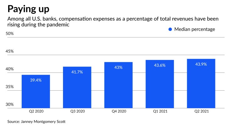 Wage increases are starting to show up in operating expenses. Among all banks chartered by the Federal Deposit Insurance Corp. in the second quarter, the median for compensation expenses as a percentage of total revenues was 43.9%, up slightly from 43.6% in the first quarter, according to a report from Janney Montgomery Scott.