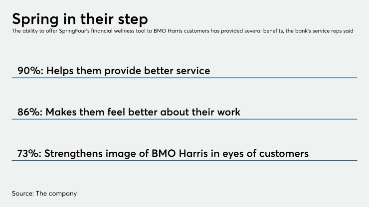 The relationship between BMO Harris and SpringFour started as a mentorship. BMO Harris and the technology incubator 1871 formed a fintech mentorship program in 2017 for startups in the Chicago area. SpringFour was a mentee in that first year. Then the bank began using SpringFour’s tools in 2018.