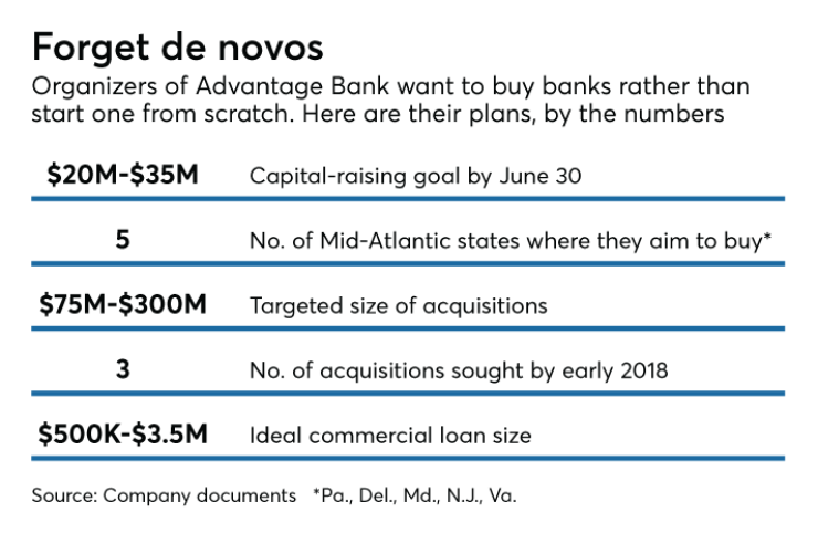 Buying an established bank would give Advantage immediate access to deposit insurance. Organizers want to buy a bank with $75 million to $300 million in assets based in Pennsylvania, Delaware, Maryland, New Jersey or northern Virginia, according on documents circulated by organizers. The group has outlined plans to buy three institutions by early next year.