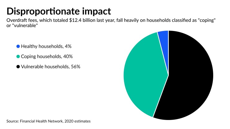 Research by the nonprofit Financial Health Network found that roughly 56% of the estimated $12.4 billion in overdraft fee revenue collected by banks last year came from households that were classified as “vulnerable,” meaning that they struggle in almost all areas of their financial lives.