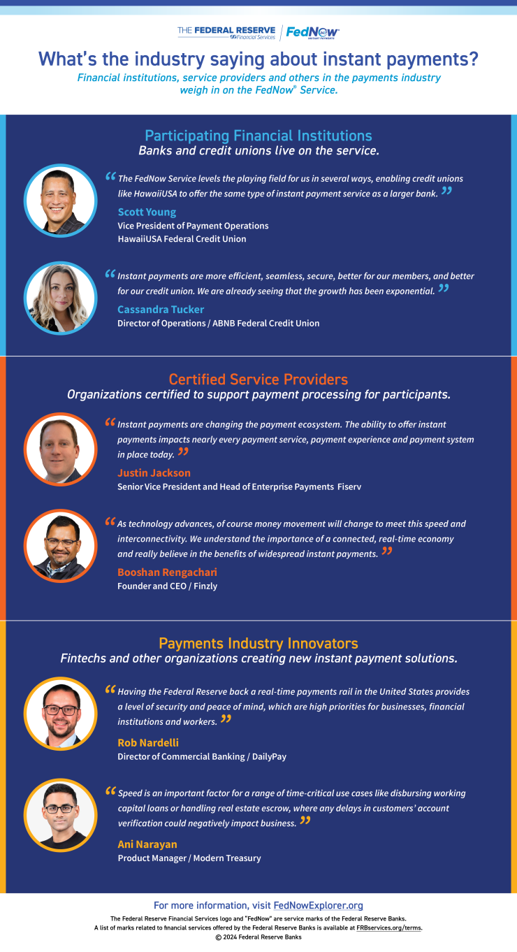 Since its launch in July 2023, banks, credit unions and others across the U.S. are leveraging the FedNow® Service, an instant payments infrastructure that enables participants to send and receive payments within seconds — 24 hours a day, seven days a week.