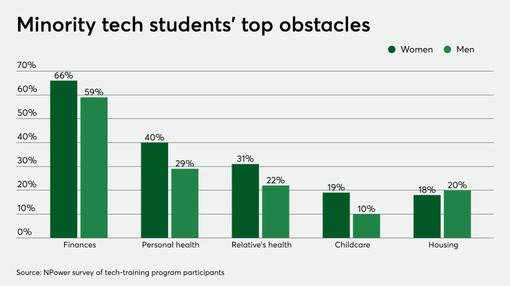 Women faced significantly tougher conditions than men, though a higher number of men said they struggled with housing. The research drew on experiences of 1,000 NPower students and alumni plus 60 employers, scholars and leaders in peer organizations.