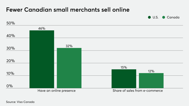 About half, or 46%, of U.S. small businesses sell their products online, but only about a third of Canada’s small businesses do, according to Sarah Steele, senior director of Visa small business products.