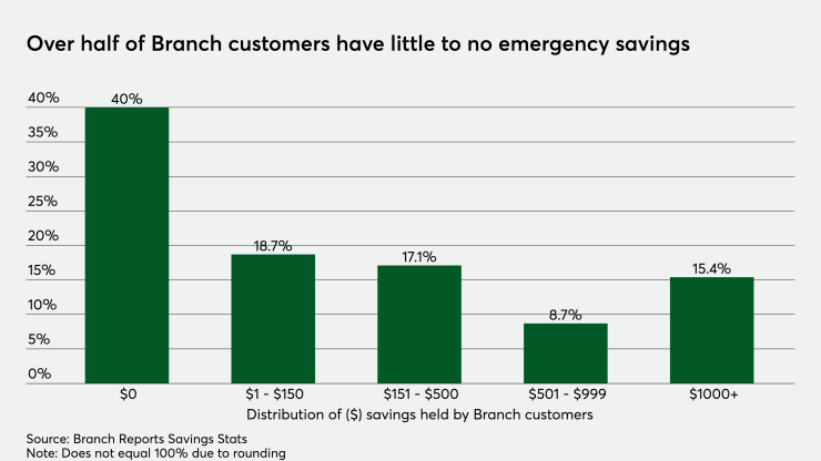 Branch customers tend to be less able to meet any such emergency; a survey of its customers found that 40% of its customers had no savings at all and that 18.7% had $1 to $150 in savings.
