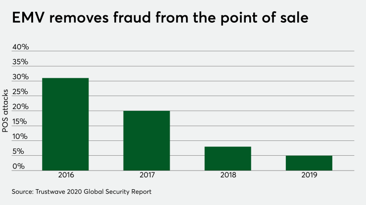 The drop in attacks at the point of sale, mostly because of EMV chip cards becoming the norm across the globe to derail counterfeit card fraud, is a sharp contrast with just four years ago when