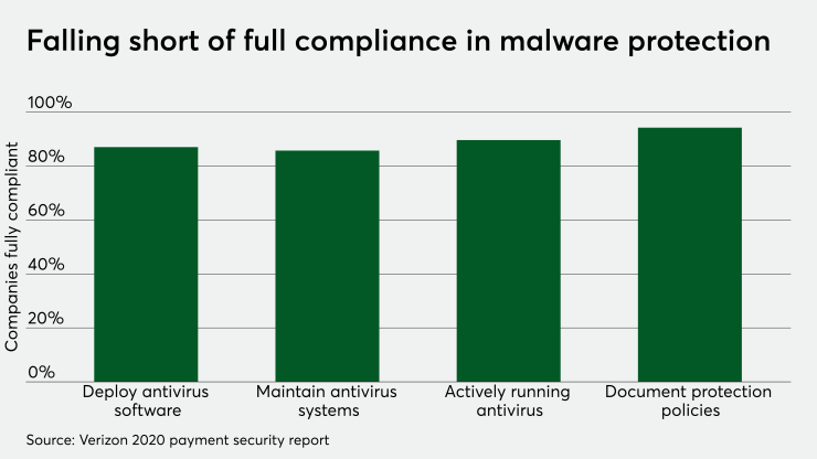 Even requirements that continued to show high compliance rates registered slight decreases in full compliance. The requirement for thwarting malicious software was one example, with full compliance falling 3.1% from the previous year. Yet, various aspects of the requirement had high compliance marks, such as documenting protection policies at 94% compliance.