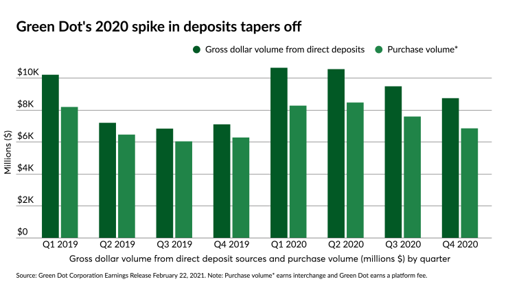 “Gross dollar volume in the quarter was also boosted by a second round of stimulus funds received late in December, which added approximately $570 million during the last two days of 2020," said Jess Unruh, interim chief financial officer and chief accounting officer at Green Dot, in the earnings call. “Our gift card revenue has been negatively impacted by the decline in retail foot traffic because of COVID.”