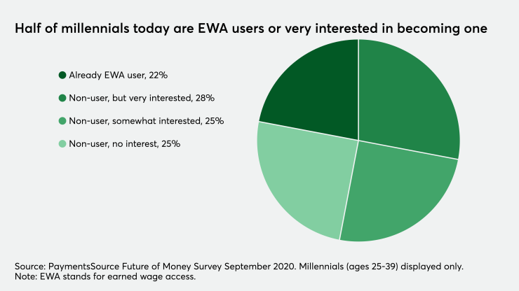 According to a PaymentsSource Future of Money Survey conducted in September, half of millennials today are either existing EWA users (22%) or very interested in becoming an EWA user (28%). Another 25% expressed some interest in using EWA services, reflecting their popularity among younger consumers who are getting established in their lives, building families or buying homes.