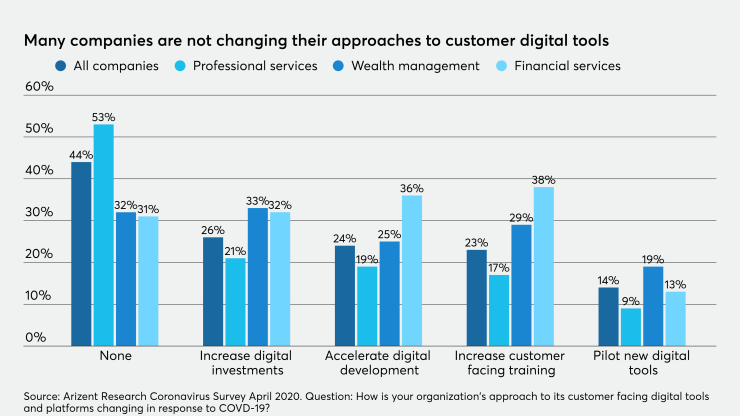 When asked about changes to digital strategies, a fair number of companies (44% overall) reported that they would not change their approach. Less than one-third of financial services firms (31%) and wealth managers (32%) said they would stay the course, while 53% of professional services firms said that they would maintain their digital approach.