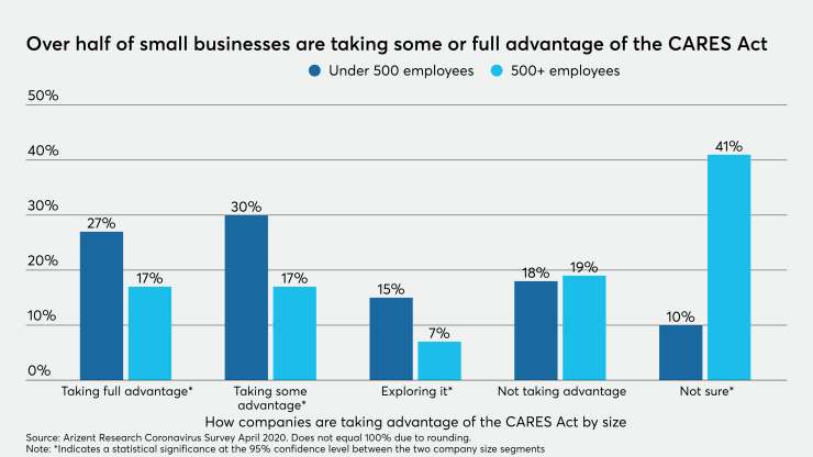 Over half (57%) of small organizations with fewer than 500 employees were taking advantage of some or all aspects of the CARES Act aid package, while only one-third (34%) of larger organizations with more than 500 employees were taking advantage of the CARES Act.