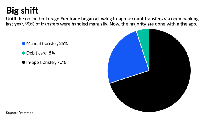 Since introducing payments initiation, Freetrade has seen a 70% reduction in unallocated deposits and an 18% increase in the average deposit value, Roberts said. Now 70% of Freetrade’s investors choose open banking payments as their funding option; manual bank transfers have fallen from 90% of total deposits to 25%, and card payments to 5%.