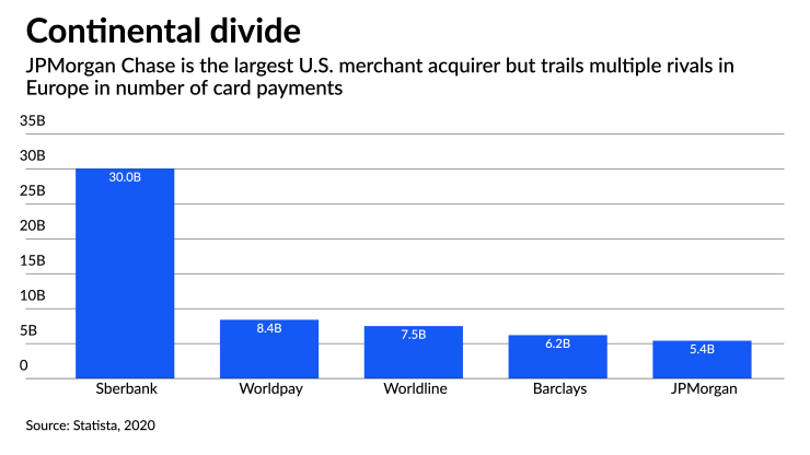 In the U.S., JPMorgan is the largest merchant acquirer, processing 27.6 billion transactions in 2020, according to