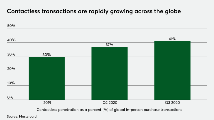 Mastercard noted that due the pandemic, contactless payment adoption has been rapidly growing and represented 41% of global in person purchase transactions in the third quarter of 2020, up from 37% in the second quarter and 30% one year earlier.