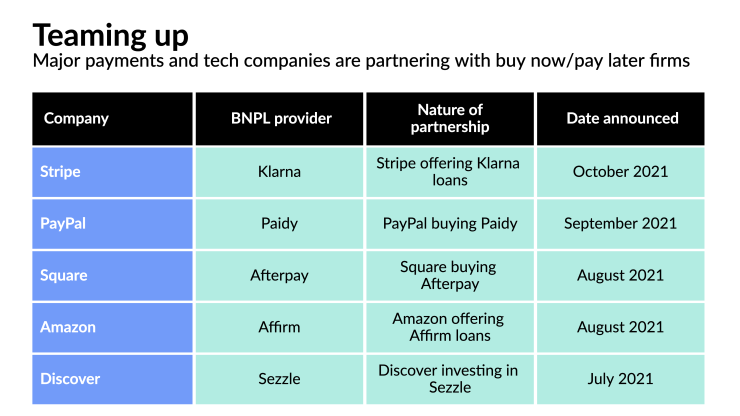 The partnership comes after rival BNPL firms such as Affirm, Afterpay and Sezzle have also teamed up with large payment technology companies for integrations. While issuers such as