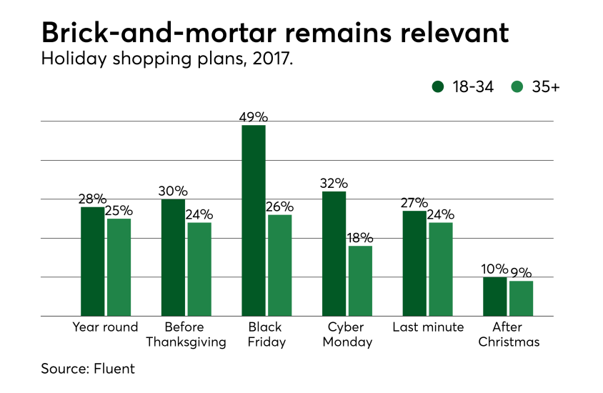 According to research by Fluent, 49% of 18- to 34-year-olds plan to shop on Black Friday this year, as well as 26% of 35-plus-year-olds. The youthful exuberance for Black Friday markedly contrasts with older generations for whom the novelty of scooping up bargains in busy retail stores is less appealing. Nonetheless, it still outpaces Cyber Monday by a considerable margin when 32% of 18- to 34-year-olds and 18% of 35-plus-year-olds intend to shop.