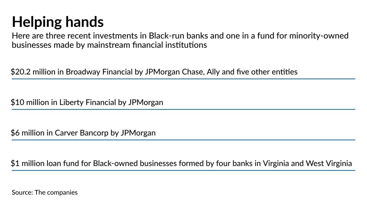 Several large and midsize banks are investing millions of dollars in Black-run banks, while four community banks have started a fund to make interest-free commercial loans in underserved communities.