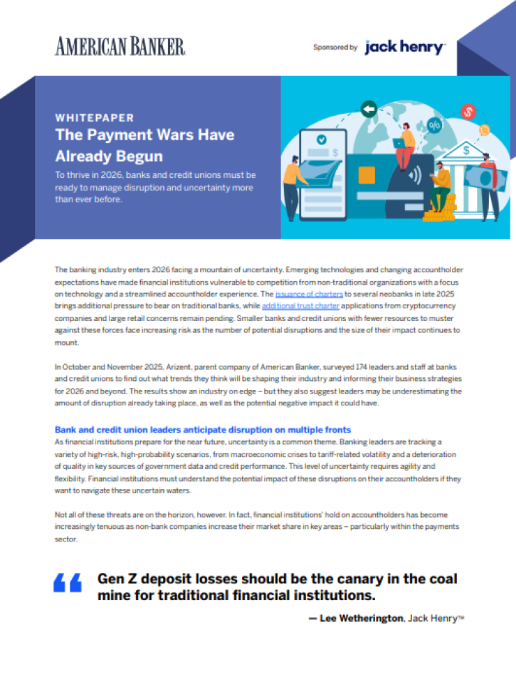 The banking industry is heading into 2026 amid unprecedented disruption, as non-bank competitors, real-time payments, stablecoins and shifting Gen Z expectations intensify the fight for deposits and the data behind them. New research from American Banker, sponsored by Jack Henry™ and based on a survey of bank and credit union leaders, reveals that the payment wars are already underway. They are highlighting where institutions feel most exposed, why payments have become the primary battleground and how deposit losses threaten long-term data, AI readiness and profitability. This white paper outlines practical steps banks and credit unions can take now to compete more effectively in a non-bank-driven ecosystem.